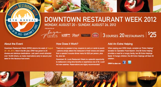 Downtown St. Louis Restaurant Week is a splendid opportunity to rediscover a long time favorite or experience one of St. Louis’ hot new eateries. Reservations are highly recommended!