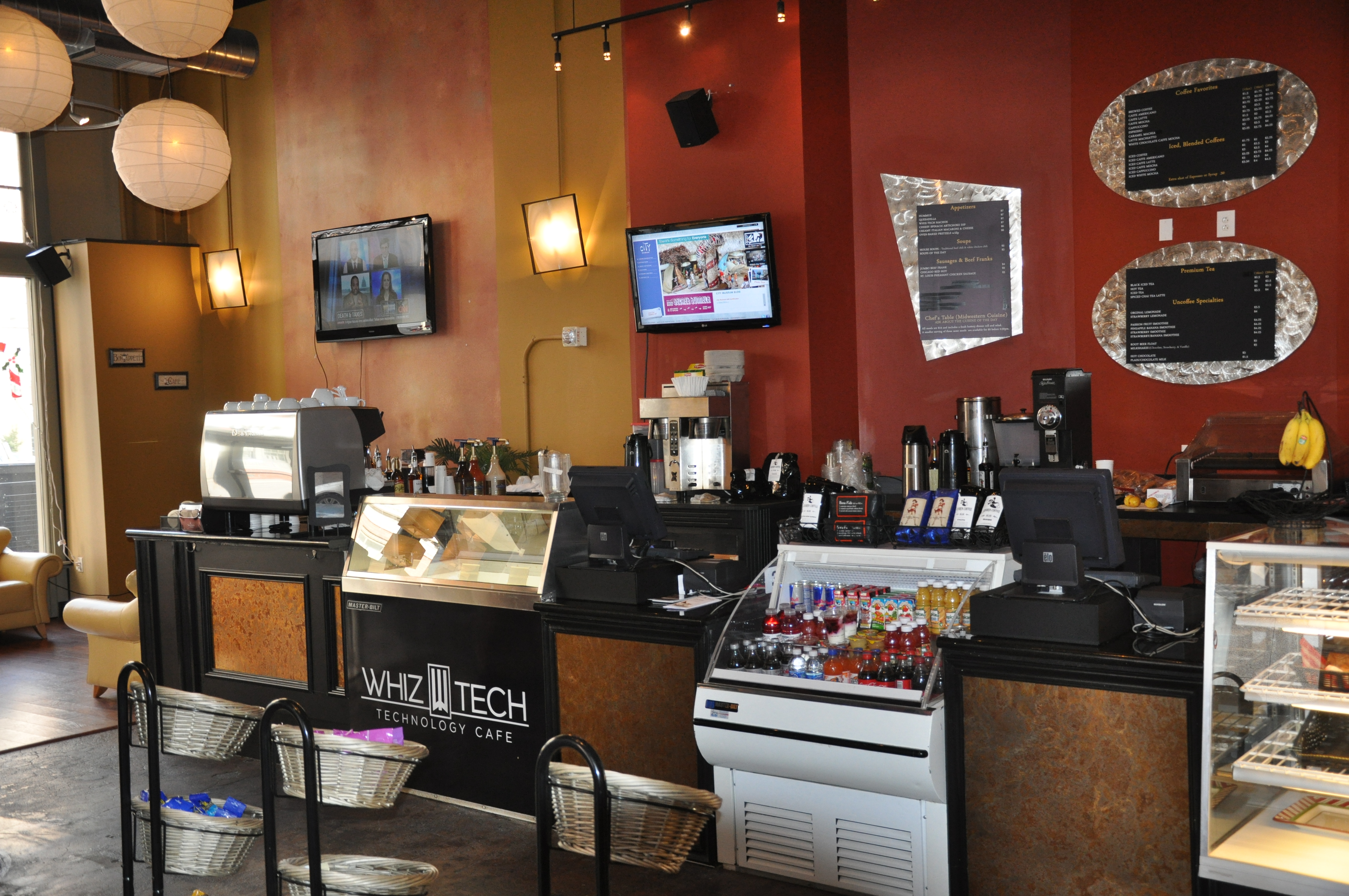 Whiz-Tech Technology Café has the ability to seat 126 patrons at any specific time. The ambience is both warm and upscale. Innovation prevails throughout the 6000 square-foot facility, and large screens televisions with relevant programming are delightfully positioned on various walls. Unique, thought-provoking décor builds character throughout the café. Lo-cal and national newspapers, along with magazines, are available to read for free while one sip on their favorite cup of Joe.