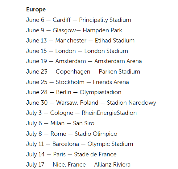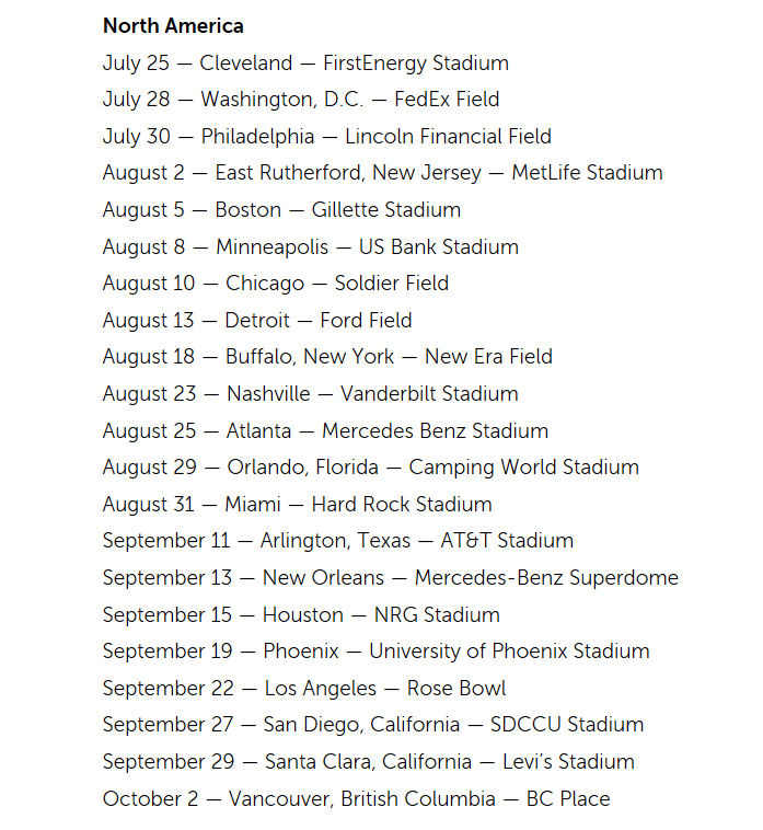 The North American portion of the tour begins July 25 in Cleveland and ending in British Columbia.