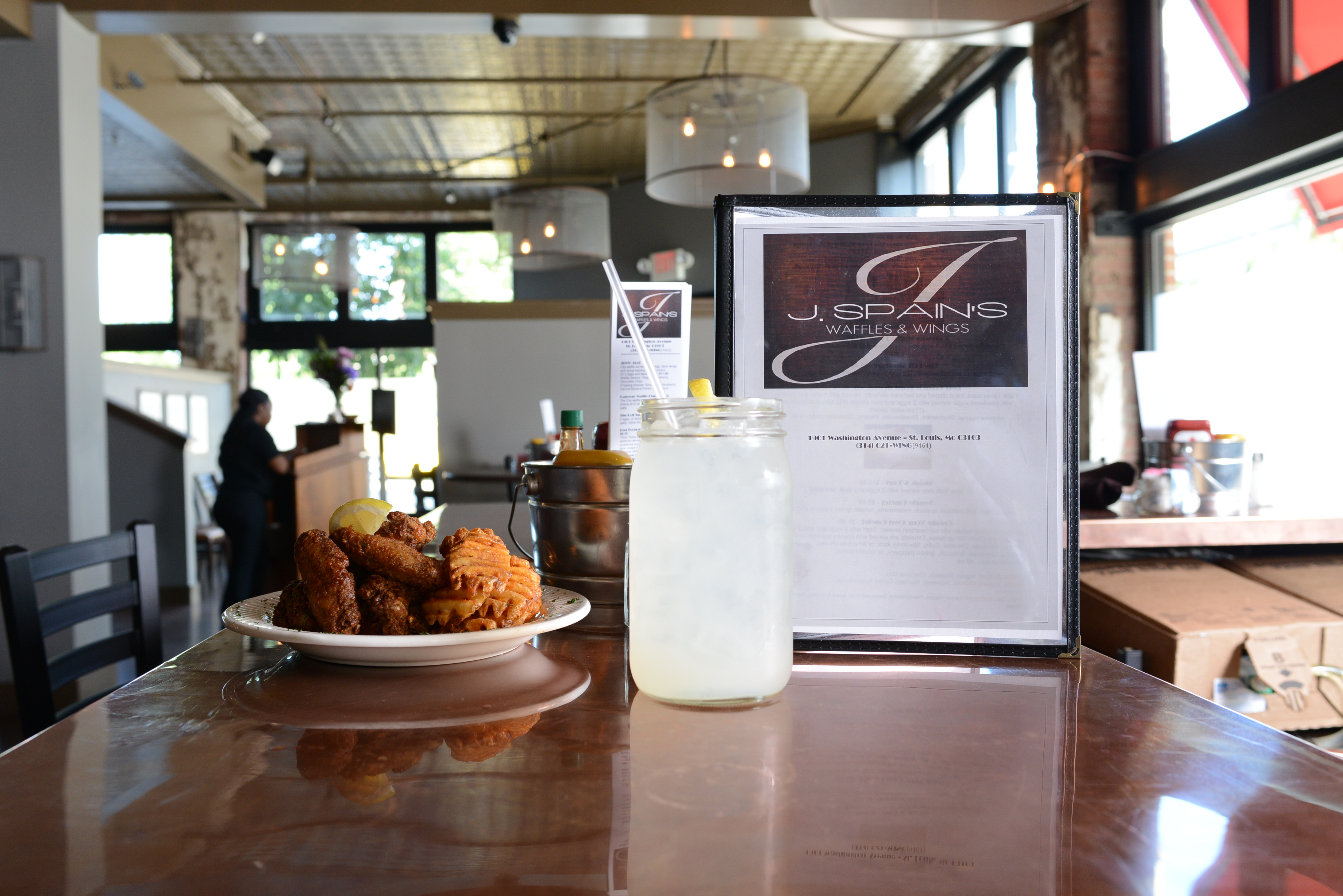 We’ve done it, St. Louis. We’re officially an urban community made whole by the healing touch of our own chicken and waffle joint. St. LOUIS! We’ve arrived! J. Spain’s Waffles & Wings finally opened its doors at the Tudor building located at 1901 Washington Ave., in the spacious restaurant previously occupied by Smoking Joe’s Bar-Be-Que.