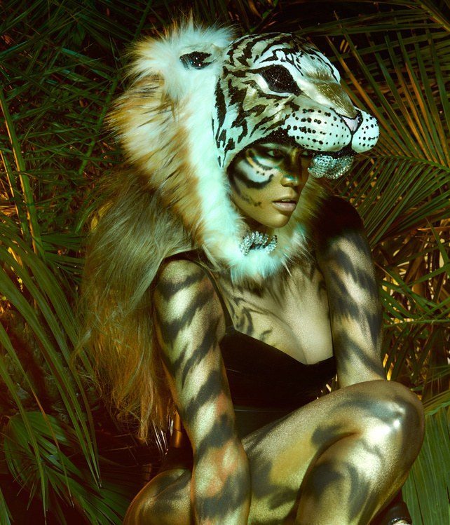 In one of the images, Banks is decked out in body paint with handcuffs as she is posing with a tiger head covering. In another photo the model in adorned in a gold bodysuit with kitty ears. The other photos also include full body shots with bejeweled bikini bottoms, thigh-high boots and other exotic looks.