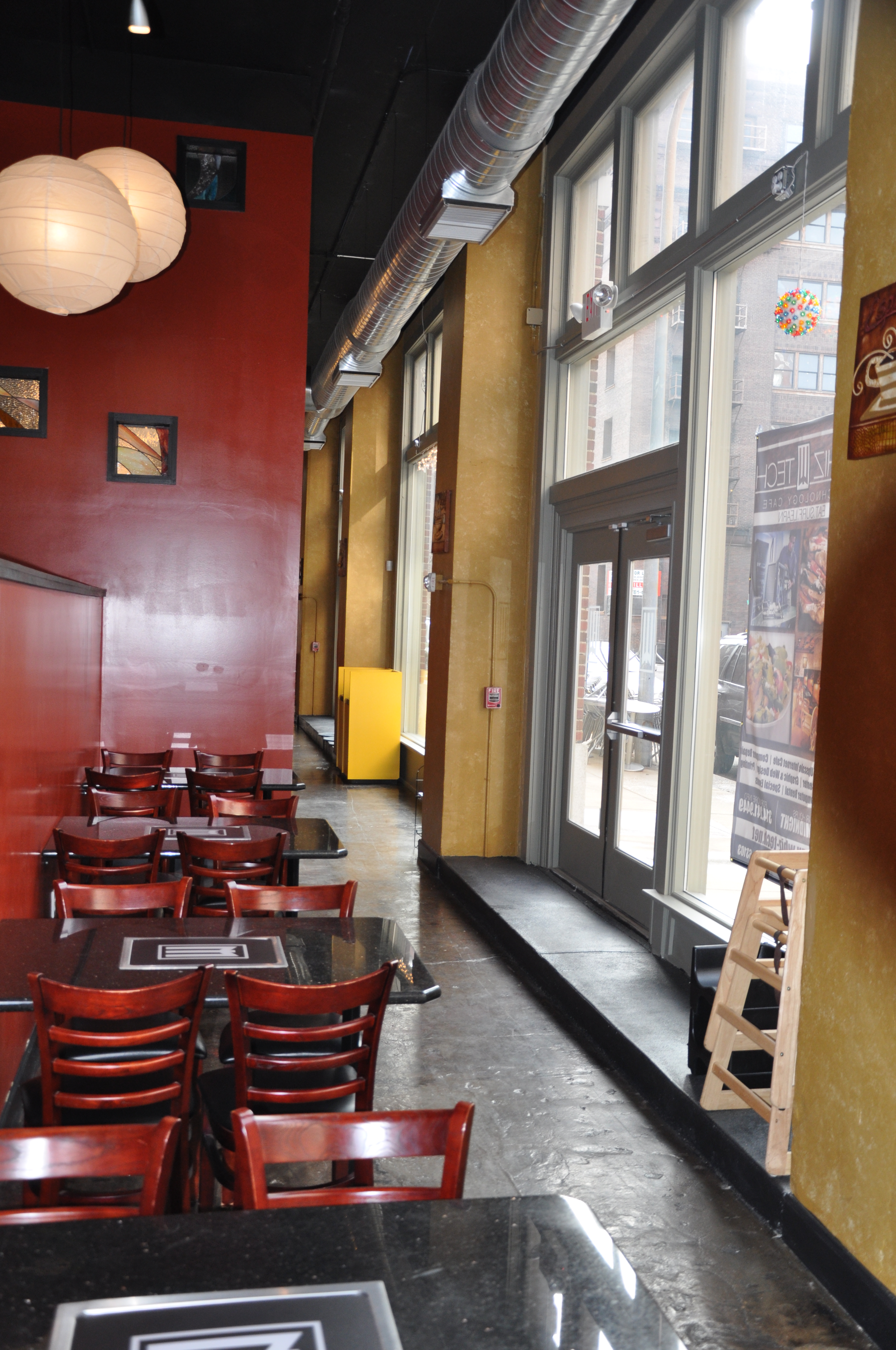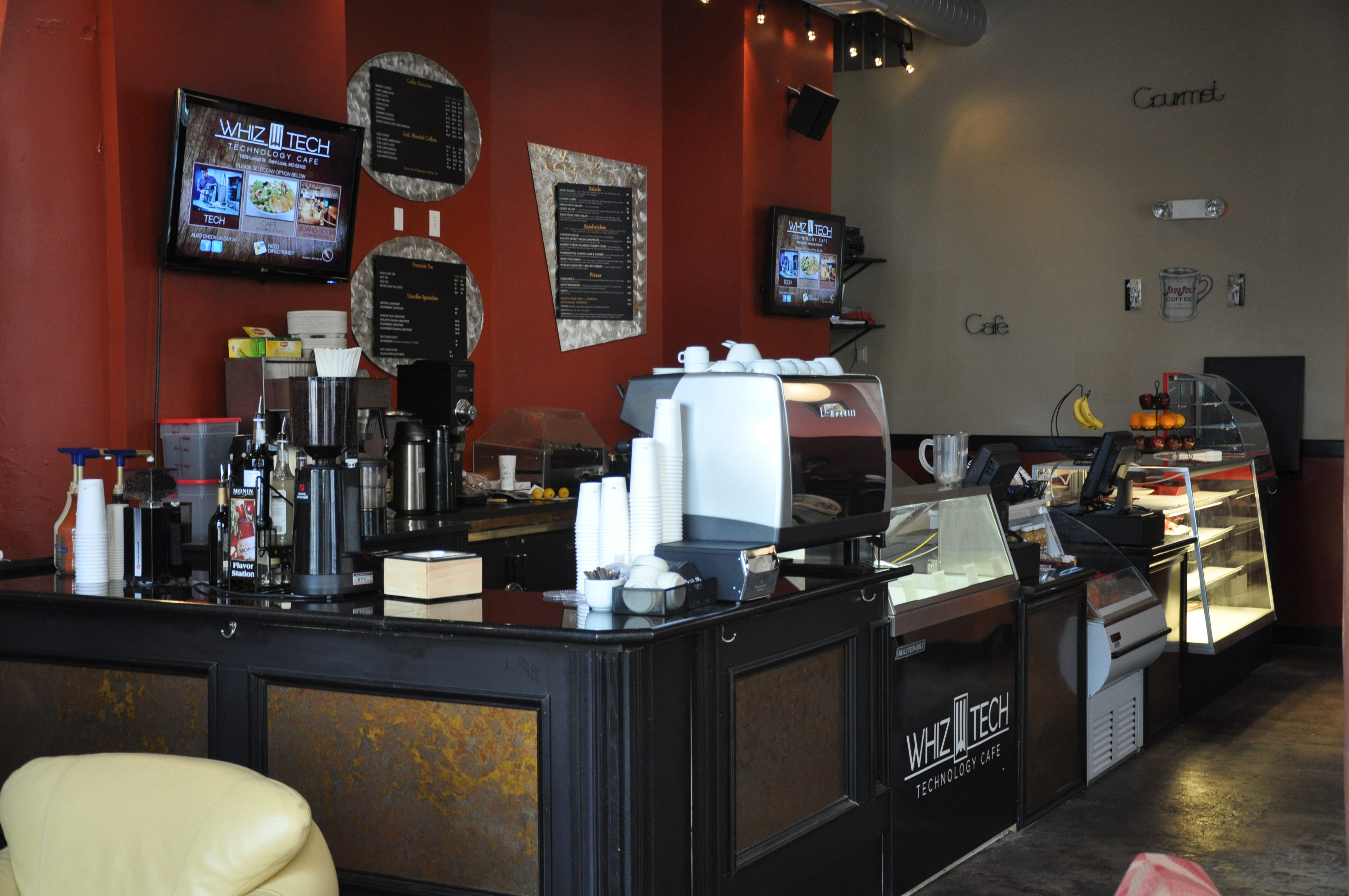 Whiz-Tech Technology Café has the ability to seat 126 patrons at any specific time. The ambience is both warm and upscale. Innovation prevails throughout the 6000 square-foot facility, and large screens televisions with relevant programming are delightfully positioned on various walls. Unique, thought-provoking décor builds character throughout the café. Lo-cal and national newspapers, along with magazines, are available to read for free while one sip on their favorite cup of Joe.